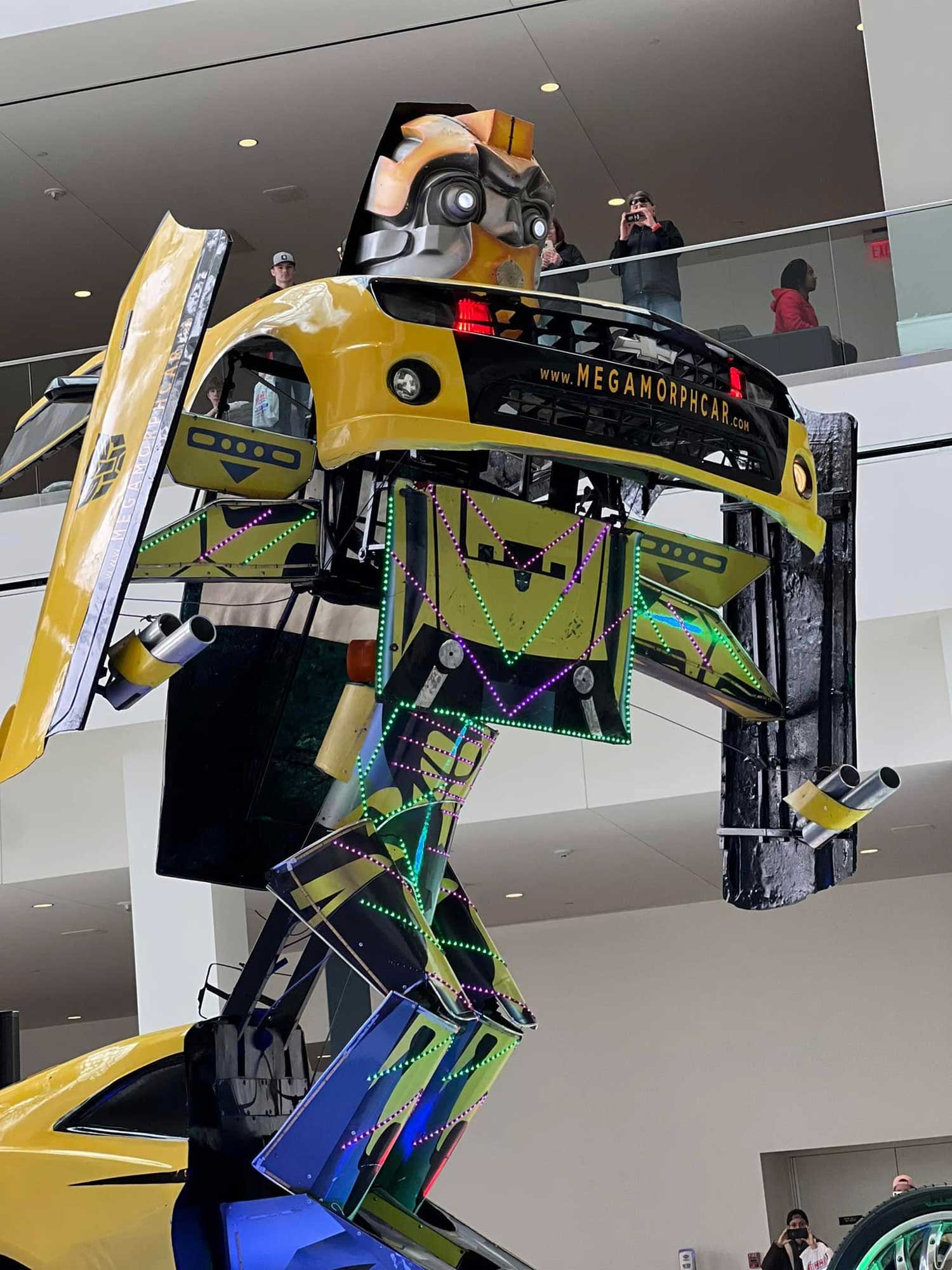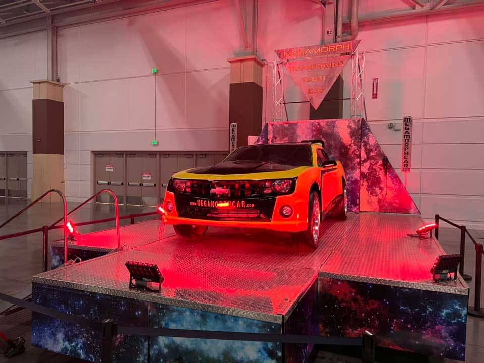 As the crowd gathers, they are treated to musical sounds of robots and machines. With all eyes, cameras and phones locked on what seams to be a normal Chevy Camaro, the music suddenly changes. As smoke creeps out of the car and luminescent lights accent the interior, the car begins to transform and within moments morphs into a robot standing almost 15′ tall. Spectators young and old alike are introduced to Megamorph and insist their friends and neighbors experience this